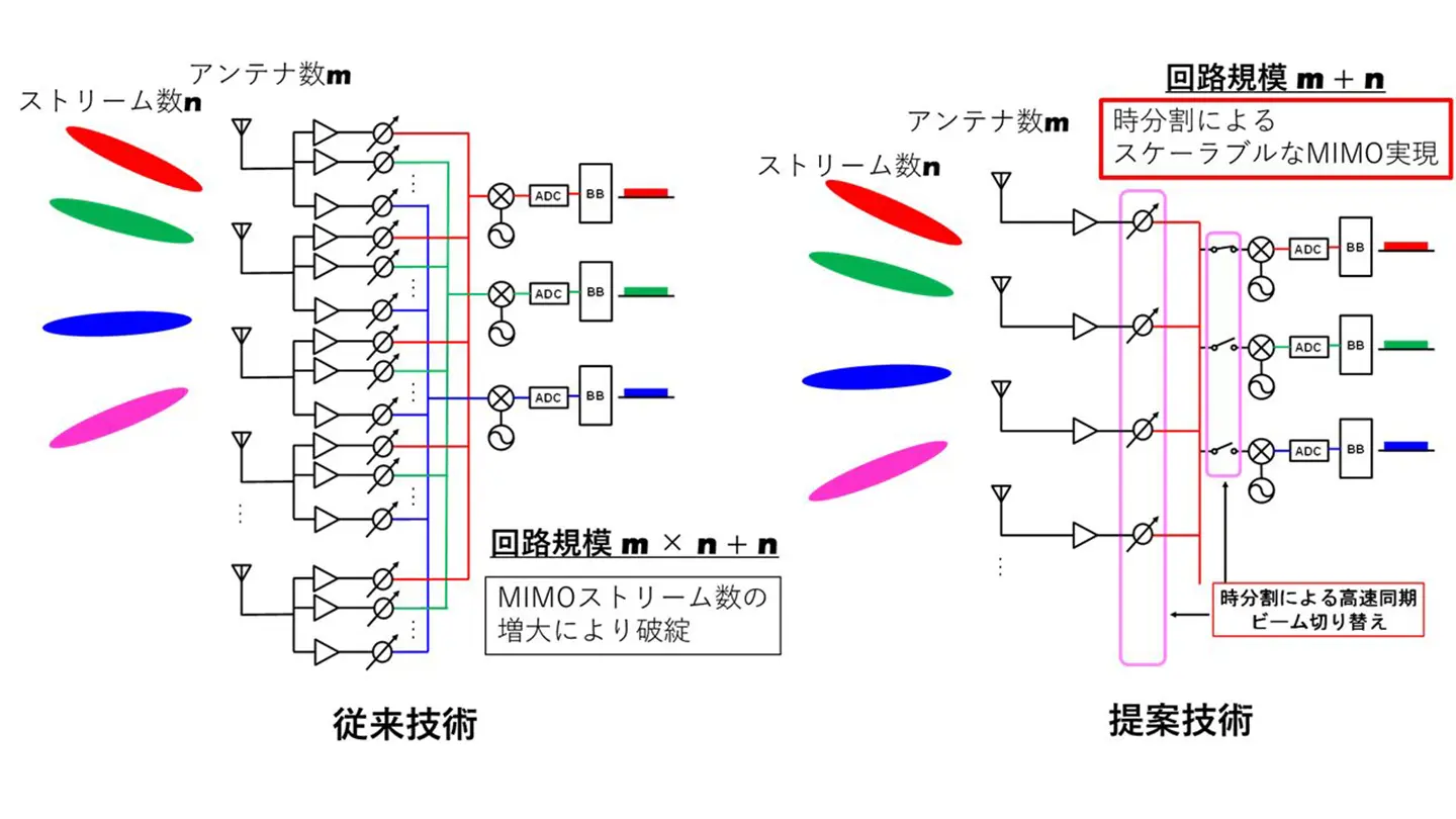 6Gでは、あらゆる場所での超高速通信を目指し、低軌道衛星等による非地上系ネットワーク[用語5]の実現が期待されており、大規模MIMO[用語6]の利用が検討されています。しかし空間分割[用語7]により複数の無線経路を確立している従来のMIMO技術では、アンテナ数とMIMOストリーム数の積に比例して回路規模が肥大化するため、大規模MIMOの集積化が困難であり、重量やサイズに制限のある衛星での利用には課題がありました。