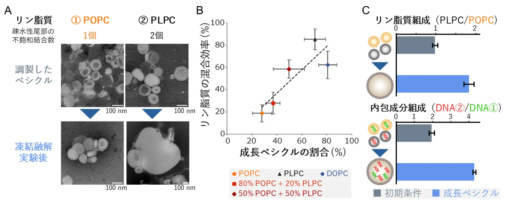 そこで本研究では、疎水性尾部の構造が僅かに異なる3種類のリン脂質(POPC、PLPC、DOPC)を材料にして小さなベシクル[用語5]を作製し、凍結・融解が及ぼす影響を多角的・定量的に比較しました。その結果、凍結融解サイクルがリン脂質ベシクルのサイズの成長を引き起こすことに加え、成長効率がリン脂質の組成に大きく依存することを発見しました(図3A)。疎水性尾部に不飽和結合がより多い膜組成ほど、より高頻度でサイズが成長すると同時に、リン脂質や内包分子など構成成分の混合もより効率よく起きる傾向が示されました(図3B)。この相関関係は、凍結・融解で生じた成長ベシクルが、成長に有利な組成を引き継ぐ可能性を意味します。