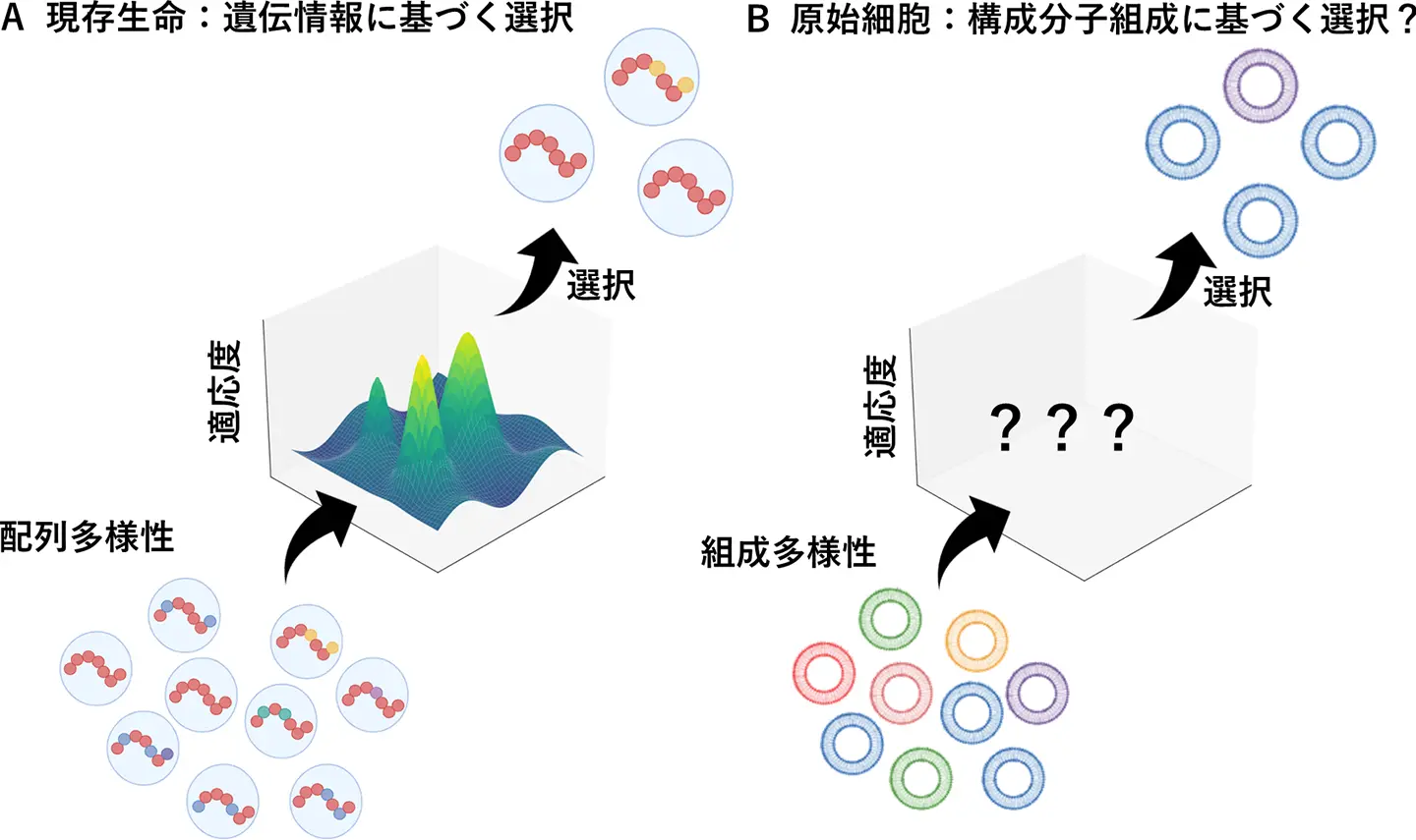 (B)地球生命の共通祖先が出現する前の原始細胞の「進化」は、現存生命の進化の仕組みよりずっと簡素だったと考えられる。例えば、構成分子の組成に多様性がある場合、その構成分子自体の物理化学的性質が直接的に原始細胞の挙動を左右し、ある性質を持つ構成分子がそのまま次世代に継承されうる。このような組成に対する選択や偏りが原始的な「進化」に繋がったかもしれない。