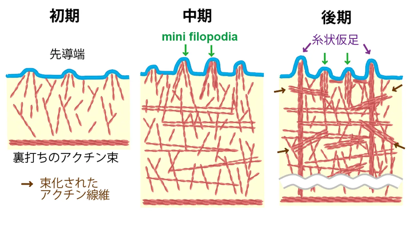 特に、アクチン細胞骨格[用語4]と細胞膜との相互作用や、形成途上にある新たな構造「mini filopodia」の発見など、細胞運動のメカニズム解明に重要な知見が得られました。