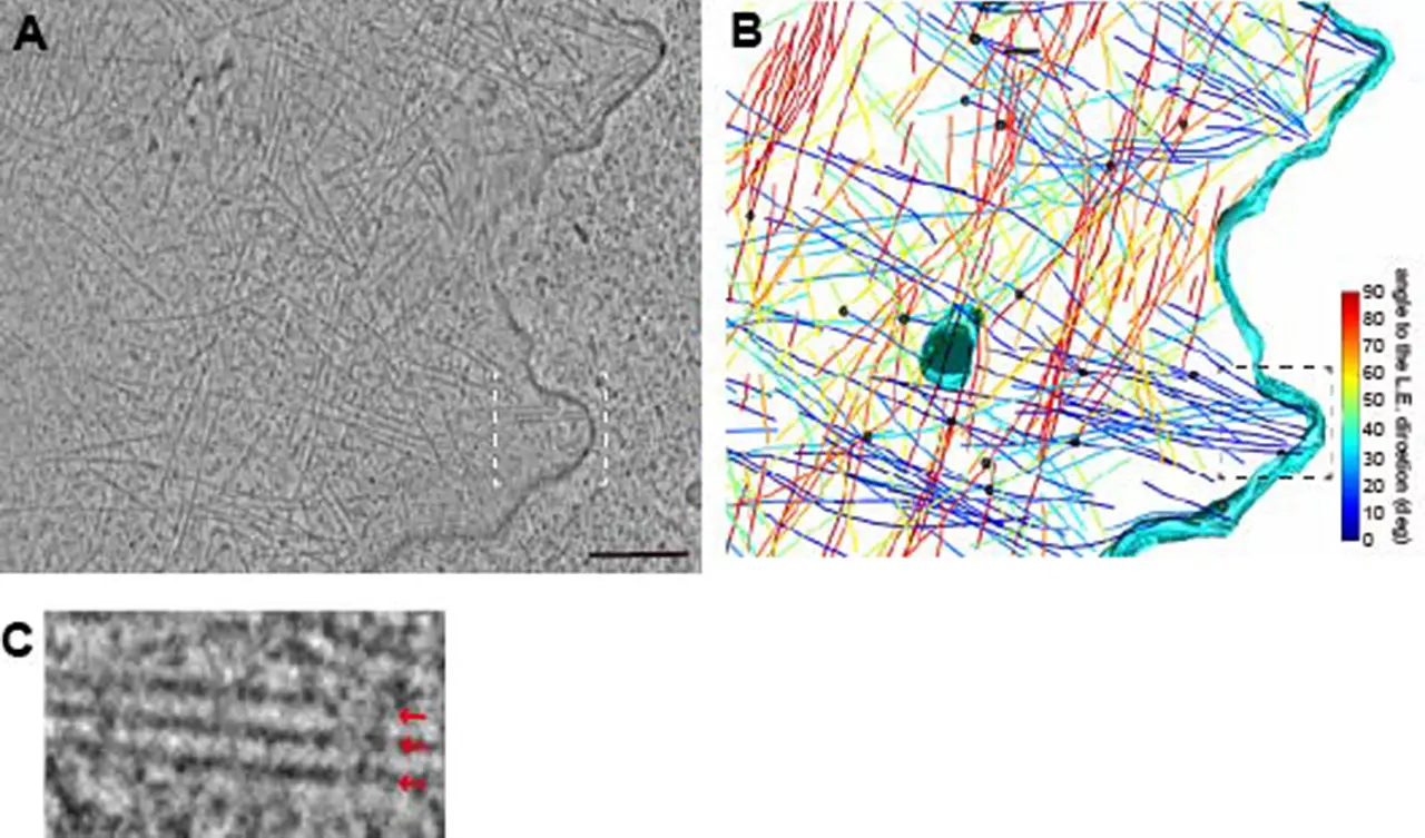 加えて、葉状仮足内部の構造や、その後端部において、もともと細胞膜を裏打ちしていたと考えられるアクチン繊維束、さらにはその近傍に存在する小胞体および周囲を走行する微小管の可視化にも成功しました。