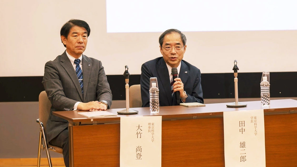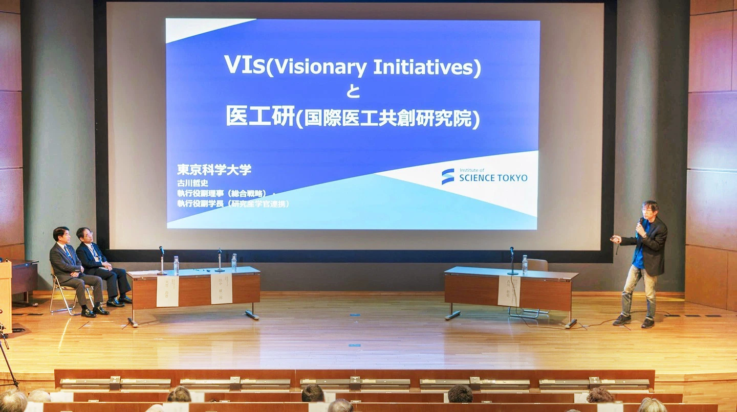 続いて第2部「Science Tokyoが目指すビジョンと研究体制について」では、Science Tokyoの大竹尚登理事長、田中雄二郎学長、古川哲史執行役副学長(研究・産学官連携担当)が登壇しました。はじめに、古川執行役副学長が、Science Tokyoが2025年4月より全学に導入した、善き未来の実現を目指す研究体制「ビジョナリーイニシアティブ(VI)」および2025年7月1日に設置した「国際医工共創研究院」について説明しました。最後に、大竹理事長、田中学長から本学の目指すビジョンについての説明がありました。