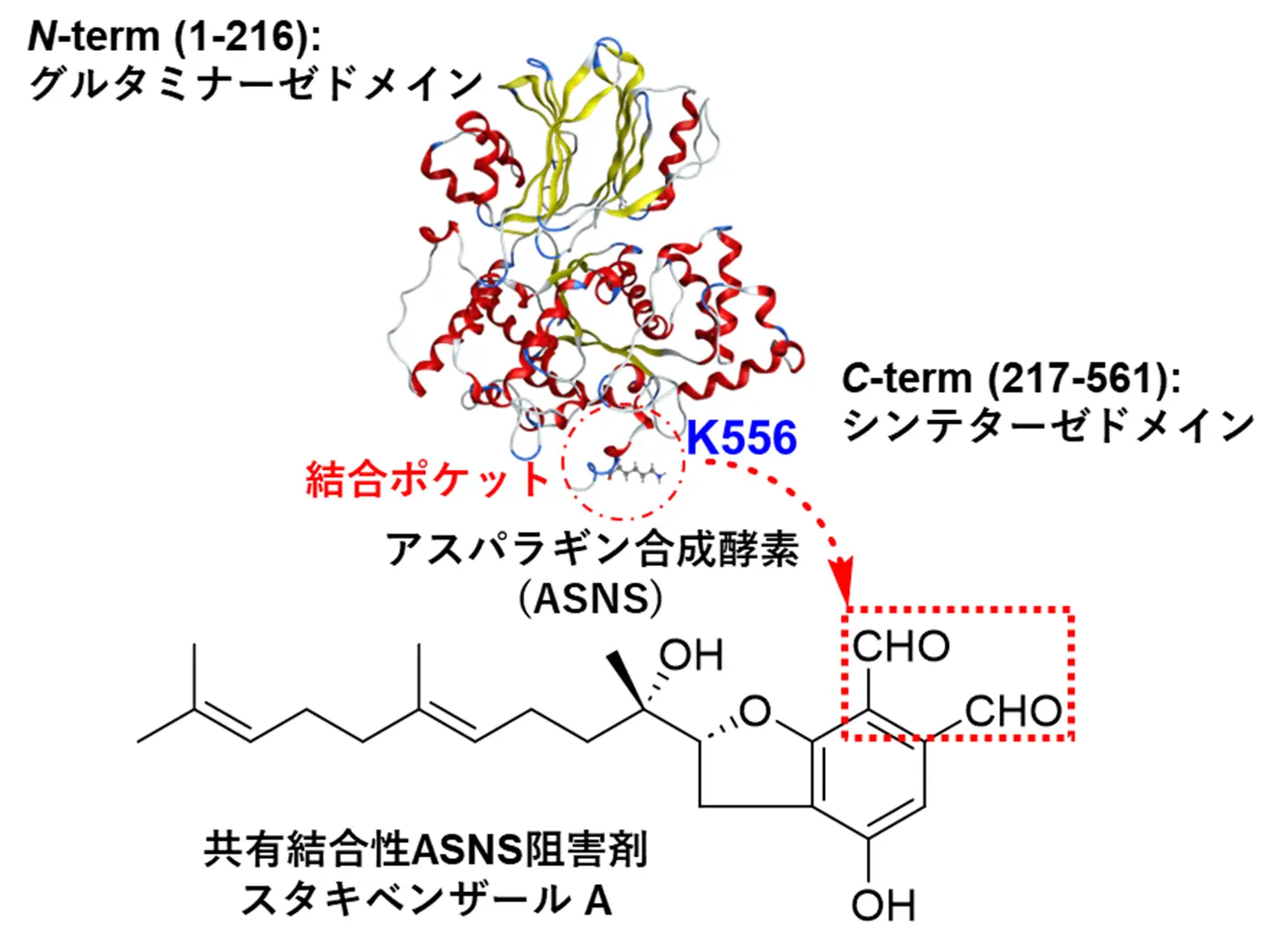 アスパラギン合成酵素(ASNS)は、L-グルタミン(L-Gln)を窒素源として、L-アスパラギン酸(L-Asp)からL-アスパラギン(L-Asn)を生合成する酵素であり、L-Asnのde novo合成[用語3]における律速酵素です。ASNSは、肺がん、大腸がん、急性リンパ性白血病などで高発現が報告されており、がんの悪性化・再発や抗がん剤耐性に寄与する酵素です。本研究グループは、共有結合性ASNS阻害剤の開発のために、リジン残基模倣化合物N-Boc-L-Lysを用いた簡便かつ高感度な評価系を構築し、スタキボトリス属の糸状菌が産生するメロテルペノイド系新規化合物スタキベンザールA~Cを見出し、ASNSの556番目のリジン残基に共有結合することで酵素活性を阻害し抗がん活性を示すことを明らかにし、がん代謝特性を標的とする新規抗がん剤開発につながることが期待されます。