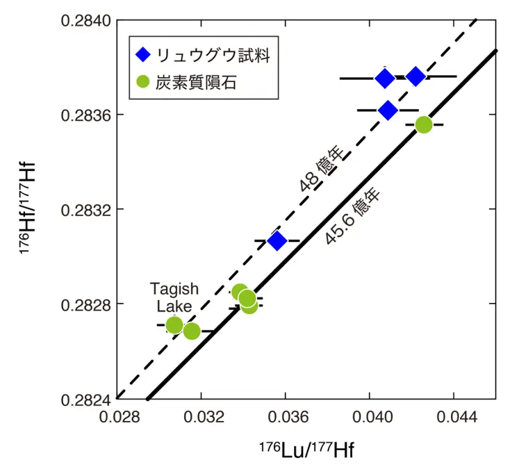 リュウグウ試料とTagish Lake隕石は48億年前の等時線[用語5]の上に分布するのに対し、他の隕石は炭素質小惑星の誕生した年代45.6億年前の等時線上に分布する。(©Iizuka et al., 2025 Natureを一部改変)