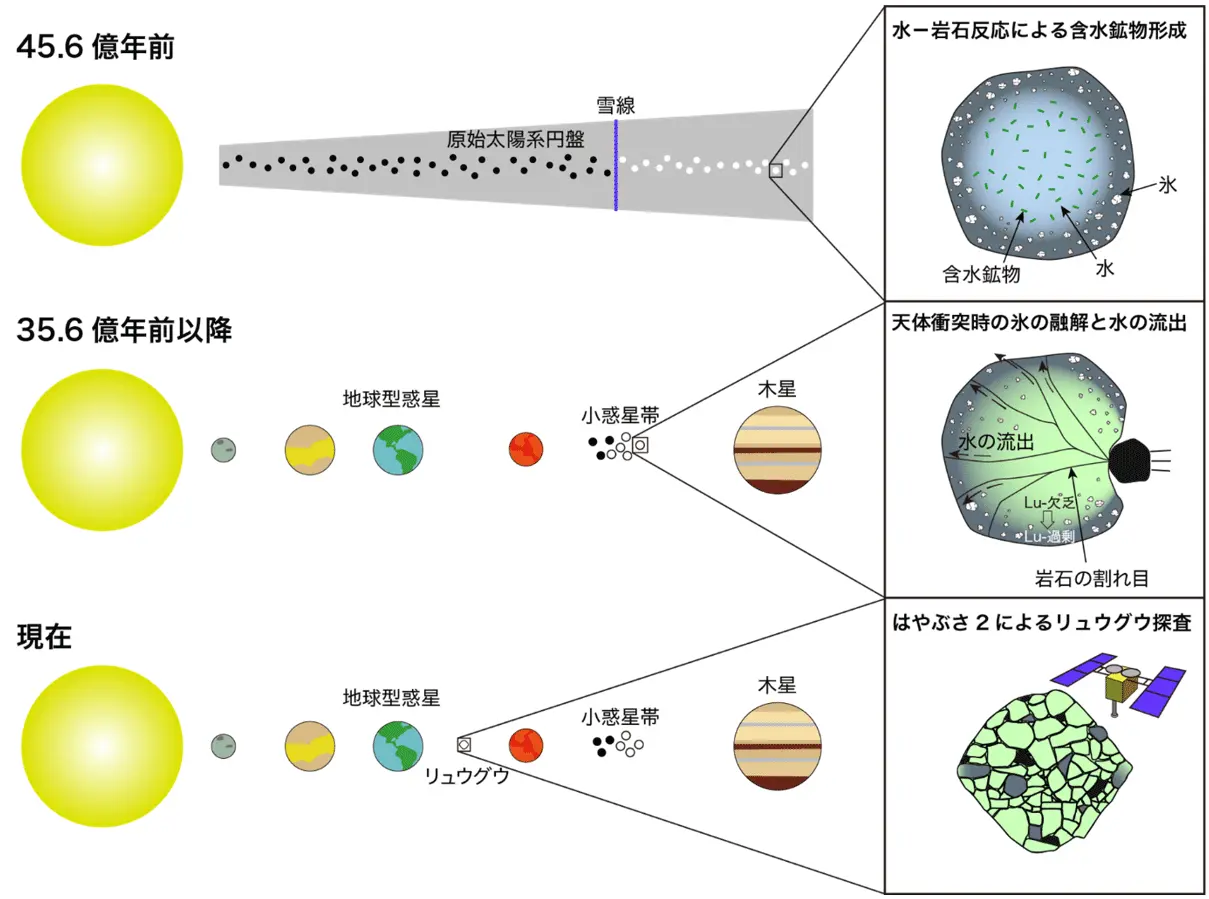 炭素質小惑星は、45.6億年前に太陽系の外側で氷、有機物、鉱物の塵が集積することで誕生し、その一部が後に太陽系の内側に移動して地球に水や炭素などの揮発性物質をもたらしたと考えられています。これまでの研究により、炭素質小惑星の誕生から数百万年の間に、氷が溶けてできた水が岩石と反応し、含水鉱物[用語1]ができたことが知られていました(図1上)。しかし、その後の太陽系史における炭素質小惑星の水の挙動は未解明でした。本研究では、はやぶさ2がリュウグウから持ち帰った岩石試料(図1下)のルテチウム-ハフニウム同位体[用語2]を分析することにより、炭素質小惑星の誕生から10億年以上後に、氷が溶けて水が流れ出たことを明らかにしました(図1中)。この水の流出は、リュウグウの母体となった炭素質小惑星に別の天体が衝突したことで引き起こされたと考えられます。本研究の結果は、地球に集積した炭素質小惑星が、水を含水鉱物だけでなく氷として保有していたこと、そしてこの水の総量はこれまでの推定量の2〜3倍であったことを示唆します。