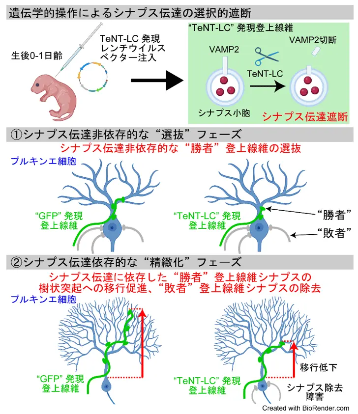 この疑問に答えるため、本研究では、一部の登上線維に破傷風毒素軽鎖(TeNT-LC[用語6])を導入することで、神経伝達物質(グルタミン酸)の放出を阻害し、登上線維とプルキンエ細胞との間にシナプス伝達が起こらない状態を人工的に作り出しました。このような操作によって、シナプス伝達を起こすことができず、プルキンエ細胞を活動させることができなくなった登上線維が、シナプス刈り込みの過程においてどのようにふるまうのかを観察しました。具体的には、(1)“勝者”を決める「選抜」のフェーズと、(2)不要なシナプスの除去と“勝者”となった登上線維がプルキンエ細胞の樹状突起へとシナプス結合領域を拡大する配線の「精緻化」のフェーズにおいて、そのふるまいを調べました。その結果、初期の「選抜」はシナプス伝達がなくても起こるが、配線の「精緻化」にはシナプス伝達が不可欠であることが明らかになりました。