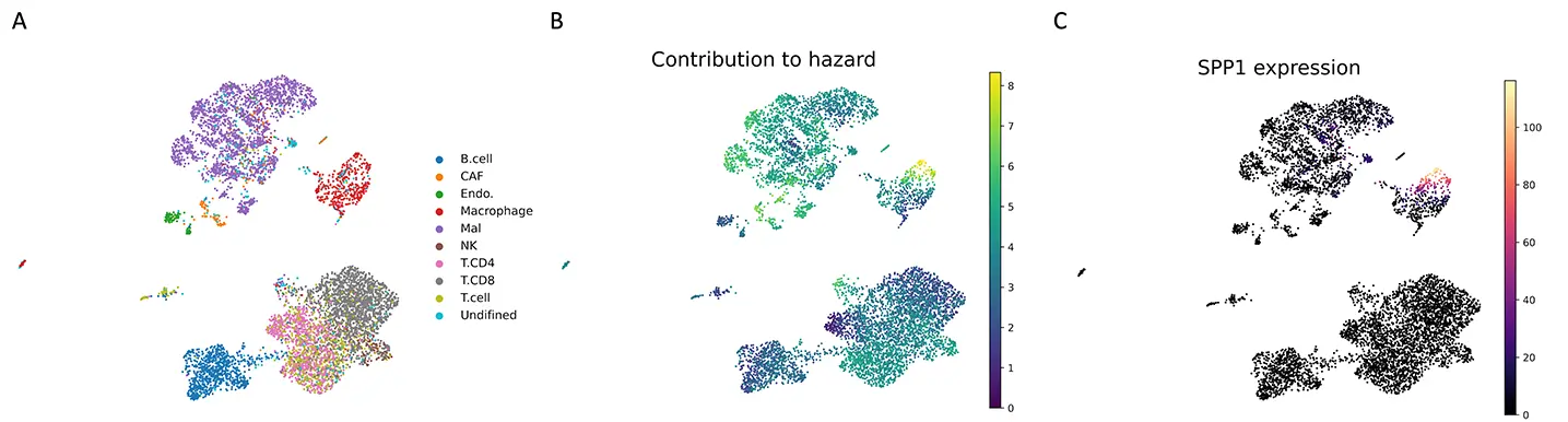 (C)SPP1遺伝子の発現。scSurvで推定されたハザードへの寄与度が大きい(予後に悪い)細胞の分布と一致している。