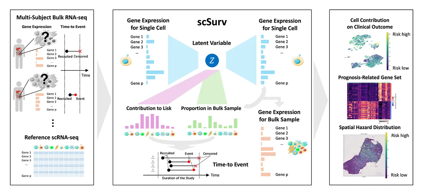 そこで本研究グループは、単一細胞RNAシーケンス[用語1]データの深層生成モデル[用語2]と、生存解析で広く用いられている Cox比例ハザードモデル[用語3]を統合することで、各細胞が臨床転帰(生存)に与える寄与を定量化できる新しい手法「scSurv」を開発しました。scSurvにより、予後に有利または不利に関与する細胞群の同定に加え、それらの寄与度と関連する遺伝子の抽出も可能になります。