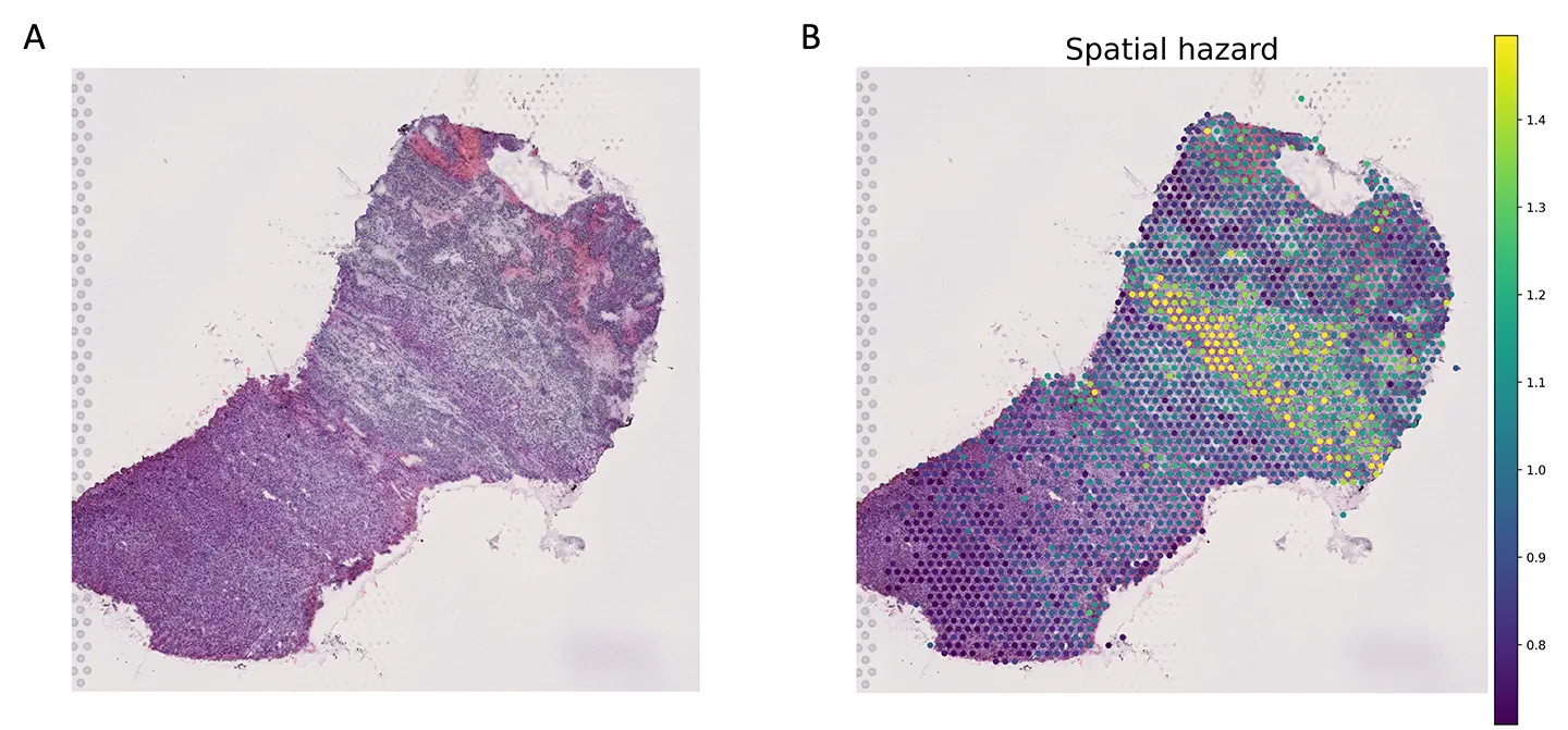 (B)scSurvにより空間ハザードを推定して病理切片上にマッピングしたもの。