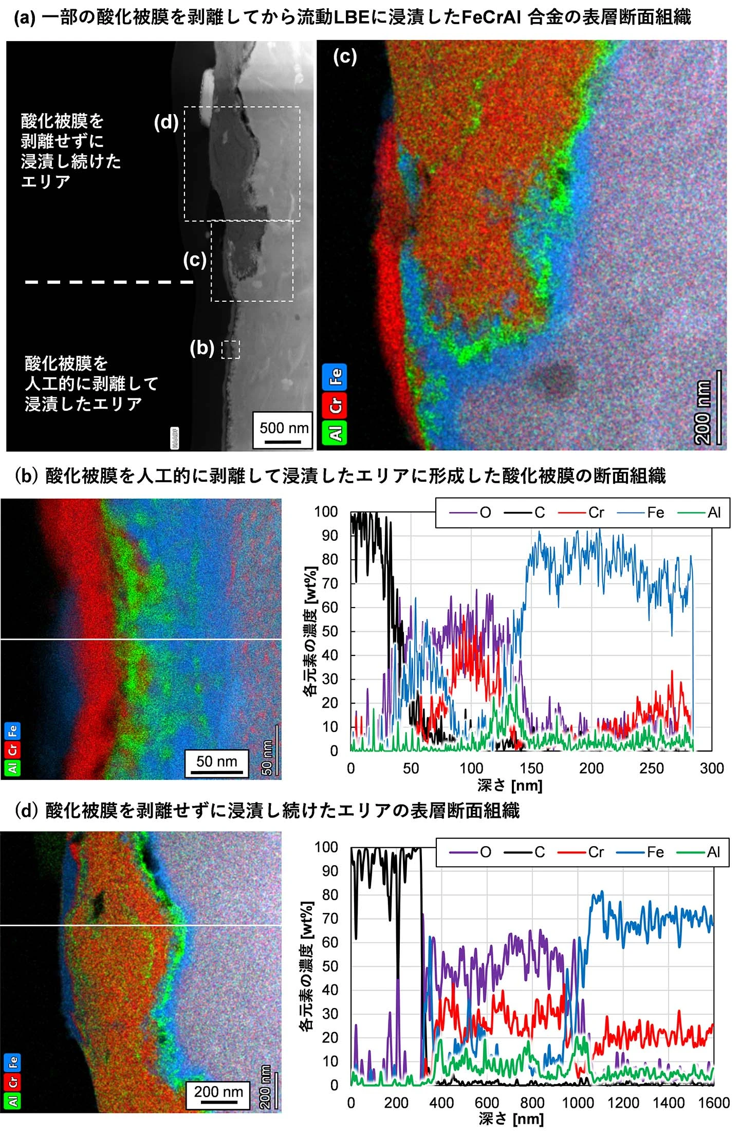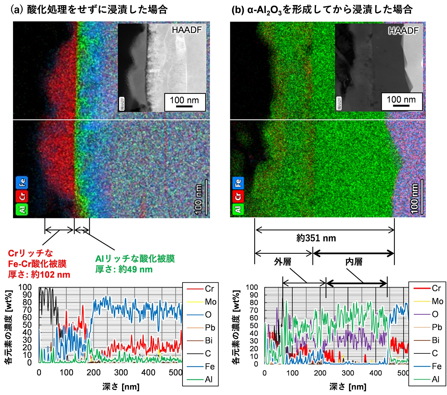 FeCrAl合金の腐食試験では、表面を研磨した試験片と、事前の酸化処理によって、優れた保護性を有するα-Al2O3被膜を形成した試験片を試験部に装荷し、2,000時間浸漬しました。図3は、透過型電子顕微鏡(STEM)を用いて浸漬後試験片の表層断面組織をナノメートル[用語6]オーダーで観察し、得られた高角度環状暗視野像(HAADF像)を白黒(グレースケール)で表示しており、原子番号の大きい元素ほど明るく映ります。一方、同じ領域についてエネルギー分散型X線分光法(EDX)により分析して得られた各元素の分布をそれぞれ色で示して重ね合わせた画像として示しています。表面を研磨したままで浸漬した試験片の表層断面の分析結果を図3(a)に示しています。解析の結果、向かって左側の最表面にはCrおよびFeに富む酸化被膜が形成され、その直下にAlに富む酸化被膜が連続的に形成されていることが確認されました。このような多層構造の保護性酸化被膜が自己形成されることにより、材料中の金属成分が流動LBE中へ溶け出すことや、PbおよびBiの組織内部への侵入が実質的に抑制されていることが明らかになりました。