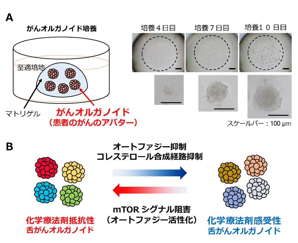 (A)がんオルガノイド培養の模式図(左)、舌がん患者の腫瘍組織から採取したがん細胞を細胞外基質を含むマトリゲルに包埋し、至適な培地条件下で培養すると、10日ほどで直径が100~200 μmほどの大きさのオルガノイドに成長する(右) 。(B)舌がんオルガノイド株の比較から、オートファジー経路およびコレステロール合成経路の活性化が舌がんの化学療法剤抵抗性に関わることが分かった(本文参照)。