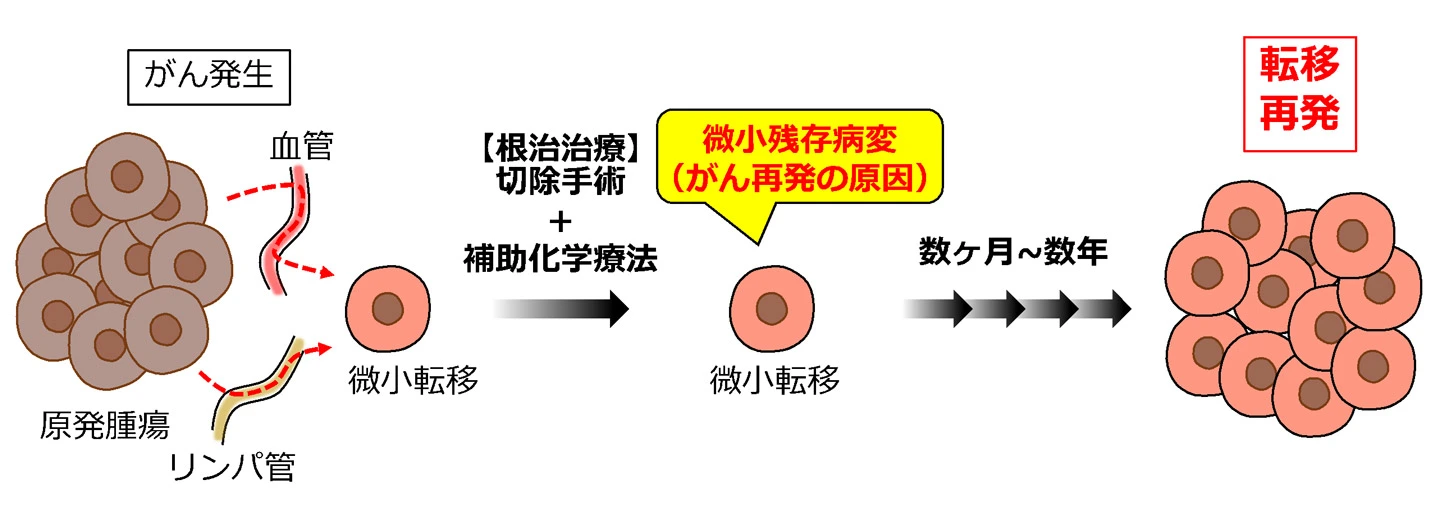 がん発生初期から、がん細胞は、血管やリンパ管を介して、遠隔臓器やリンパ節に微小転移している場合がある。原発腫瘍の切除手術と、その後の補助化学療法後に生き延びたがん細胞(微小残存病変、MRD)は、数ヵ月から数年を経て、転移組織においてがん再発を引き起こす可能性がある。