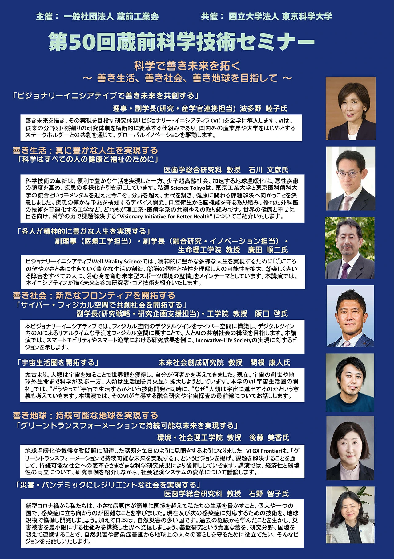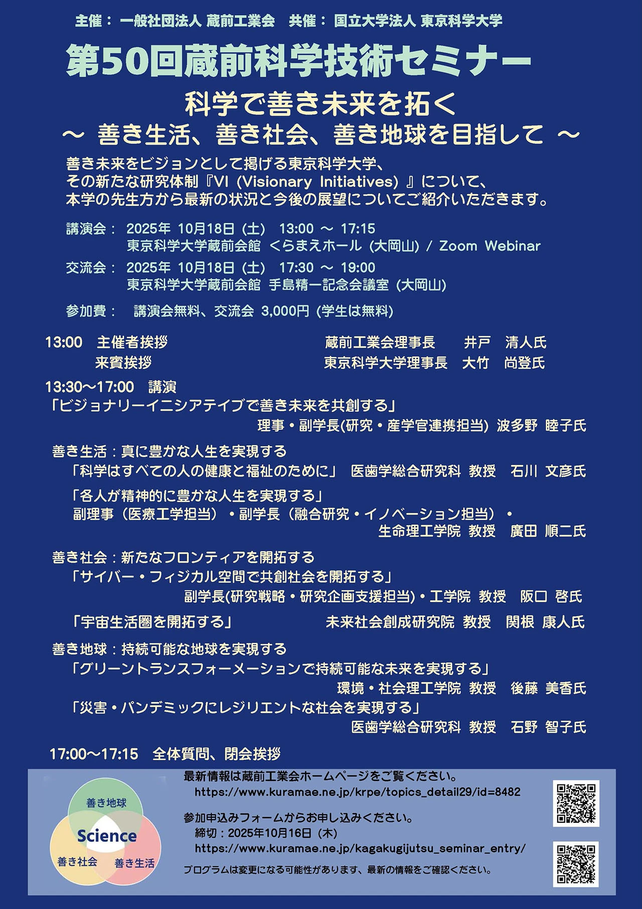 講演会:東京科学大学蔵前会館 くらまえホール(大岡山)/ Zoom Webinar 交流会:東京科学大学蔵前会館 手島精一記念会議室(大岡山)