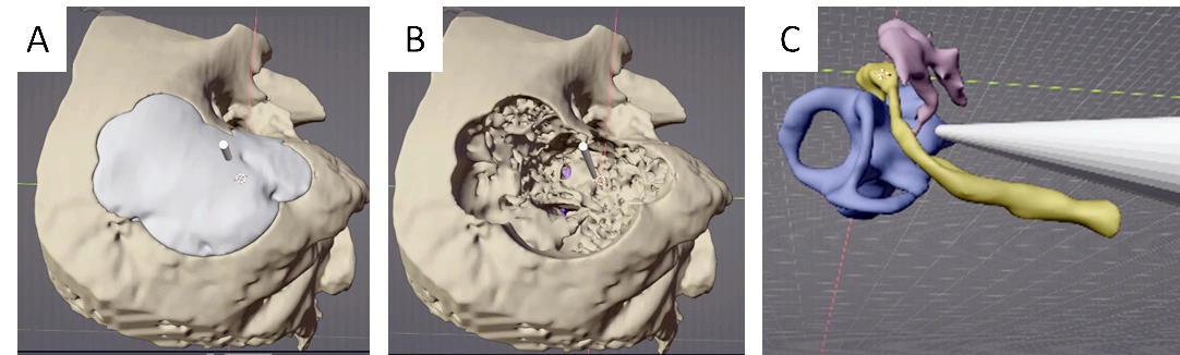 特に耳科・側頭骨領域では、神経や血管が硬い骨に囲まれているため、ドリルで削らなければその位置が確認できないことが多く、位置だけでなく深さや角度などの3次元的な空間認識が求められます。このため、ナビゲーションには、正確さ、深さ、角度などの精度に加え、手術中の空間把握を強化する3Dビジュアルへのニーズが高まっていました。
