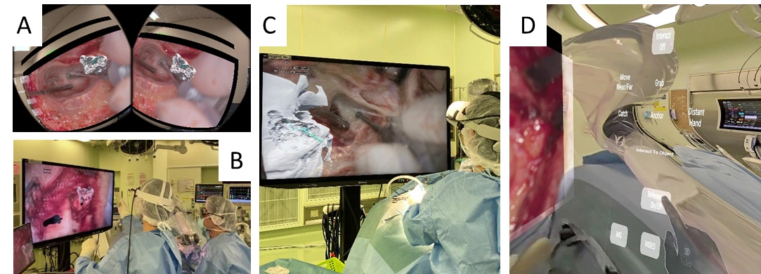 Quest 3のカラーパススルーモードを使用すると、外科医は周囲を見ながら手術映像を3Dで見ることができます (A)。監督する外科医がQuest 3を装着すると、手のジェスチャーで3D手術ガイドを操作し、3Dモニターに表示して経験の浅い外科医を指導できます (B)。Quest 3は手術中ずっと装着でき、遅延はほとんど感じられません(C)。図Cでは、外科医が3Dモニターを見ているように見えますが、実際にはQuest 3内の映像を見ており、モニターなしで手術が可能です。Quest 3には様々なタッチパネルがあり、手のジェスチャーだけでホログラムを操作し、モニターの表示を調整できます (D)。
