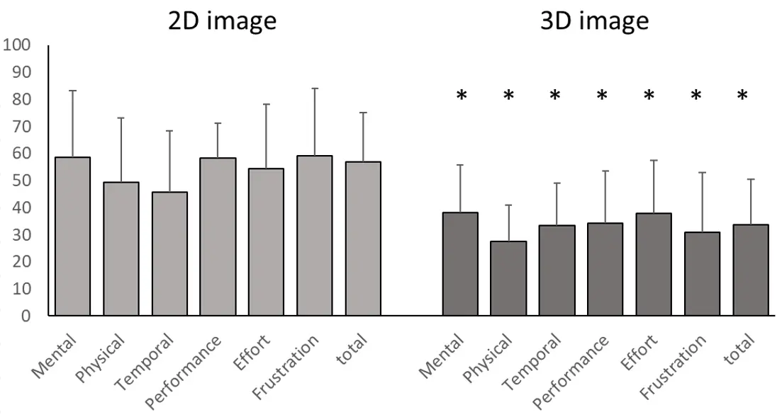 NASA Task Load Indexを使用した主観的な評価では、3Dイメージング表示はすべてのカテゴリで2Dディスプレイよりも作業負荷を軽減させるという結果となりました。