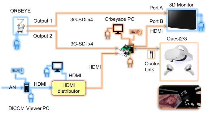 Orbeyaceシステムでは、ORBEYEの4K 3Dビデオを3DモニターとOrbeyace PCで処理し、Quest 2/3ヘッドセットに取り込むことができます。術者はQuest 2/3を装着し、ハンドジェスチャーで3Dホログラムを操作し、手術映像と統合できます。統合された映像は再びOrbeyace PCに送られ、3Dモニターに表示され、手術助手や他のスタッフが見ることができます。また、手術室内のDICOM Viewer PCからの画像もQuest 2/3内の複数のモニターに表示され、外科医はヘッドセットを外さずに手術映像と一緒に見ることができます。