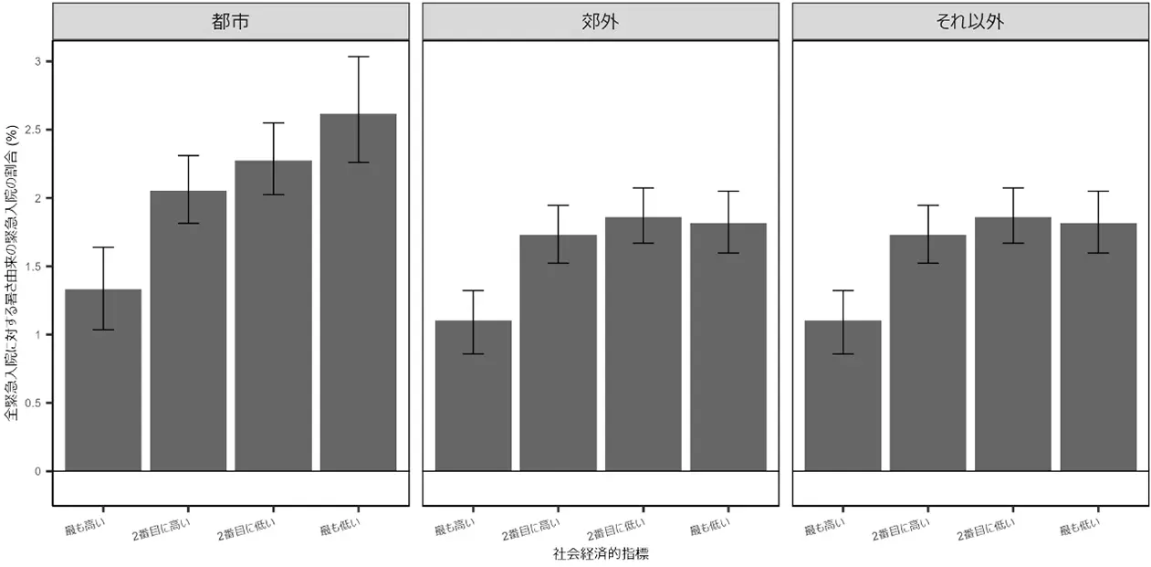 解析の結果、全緊急入院のうち暑さが要因となる入院の割合は、最も社会経済的指標が高い地域では1.19%(95%信頼区間:0.98%-1.41%)であるのに対し、最も社会経済的指標が低い地域では1.87%(95%信頼区間:1.68%-2.06%)と算出されました。このことから、社会経済的指標が低い地域ほど、暑さによる緊急入院への影響が大きいことが明らかになりました。