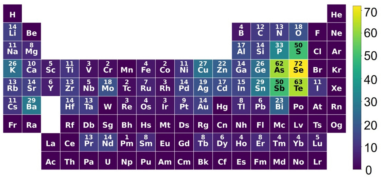 次に、1.で得られた電子構造の設計指針に基づき、Materials Project[用語7]に収録されている数万種類の既知無機化合物を対象として、計算機を用いた大規模な材料探索を行いました。その結果、従来は注目されてこなかった材料群の中に、多数の横型熱電材料の候補が存在することを見いだしました。図3には横型熱電材料として抽出された候補材料に含まれる元素の分布を周期表上に示しています。候補材料は硫黄(S)やセレン(Se)、リン(P)、アンチモン(Sb)などの元素を含む化合物に多く分布しており、加えてゲルマニウム(Ge)やスズ(Sn)を含む化合物が多いことが分かりました。また、図4には結晶の2つの異なる向きにおける電気出力とバンドギャップとの相関を示しています。両者の間には明確な相関が見られ、バンドギャップが小さい材料ほど高い電気出力、すなわち優れた発電性能を示す傾向が確認されました。これは、電子と正孔の両方が輸送に関与しやすい材料ほど、横型熱電特性が高くなることを示しており、1.で示した電子構造の設計指針を強く裏付ける結果です。特に、両方向で電気出力がともに大きい領域(図4の赤枠で囲った領域)は、横型熱電発電に適した材料領域であることを示しています。これらの解析を通じて、大きな電力を生み出せる横型熱電材料の有望候補として、最終的に57種類の材料を見いだしました。