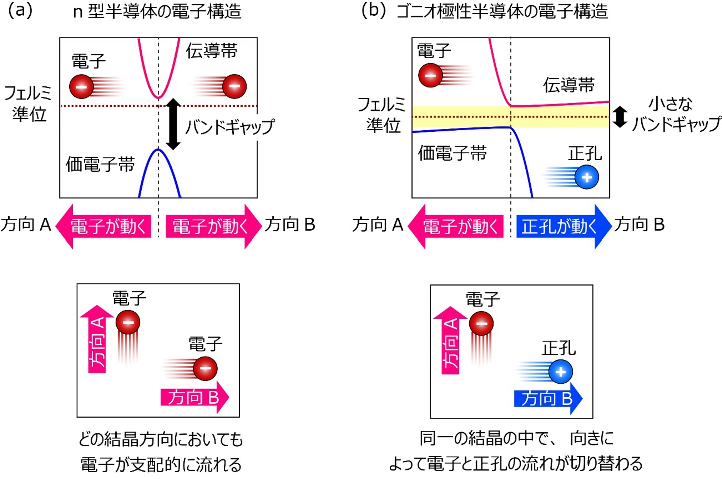 これに対し、ゴニオ極性半導体では、結晶方向によって支配的なキャリア種が変わる電子構造が必要となります(図2(b)の上図)。そのための第一の条件は、電子と正孔の両方が電気伝導に関与できることです。伝導帯と価電子帯の間隔、すなわちバンドギャップが十分に小さい場合には、熱エネルギーによって伝導帯には電子が、価電子帯には正孔が十分な数生成されるため、両者が電気伝導に関与することが可能になります。