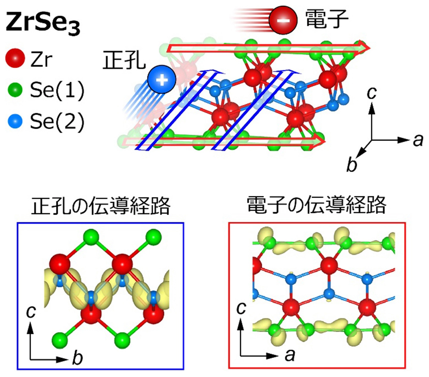 代表的な横型熱電材料候補として抽出されたセレン化ジルコニウム(ZrSe3)について、結晶構造中における電子および正孔の伝導経路を詳しく解析しました(図5)。ZrSe3はZr原子と2種類のSe原子(Se(1)とSe(2))から構成されており、a方向とb方向で異なる結合ネットワークが形成されています。電子は主にSe(1) 原子からなる結合ネットワークを通して流れやすく、a方向に優先的な伝導経路を持ちます(赤矢印)。一方で、正孔は主にSe(2)原子を中心とした結合ネットワークを通って流れ、電子とは直行するb方向に優先的に輸送されます(青矢印)。このようにZrSe3では、電子と正孔が結晶中の異なる結合ネットワークを通って流れるため、結晶の向きによってキャリアの動きやすさが大きく異なります。その結果、ある結晶方向では電子が、別の方向では正孔が電気伝導を支配するという特異な電気伝導が実現できると期待されます。以上の結果は、提案した設計指針が実在材料においても有効であることを示しています。