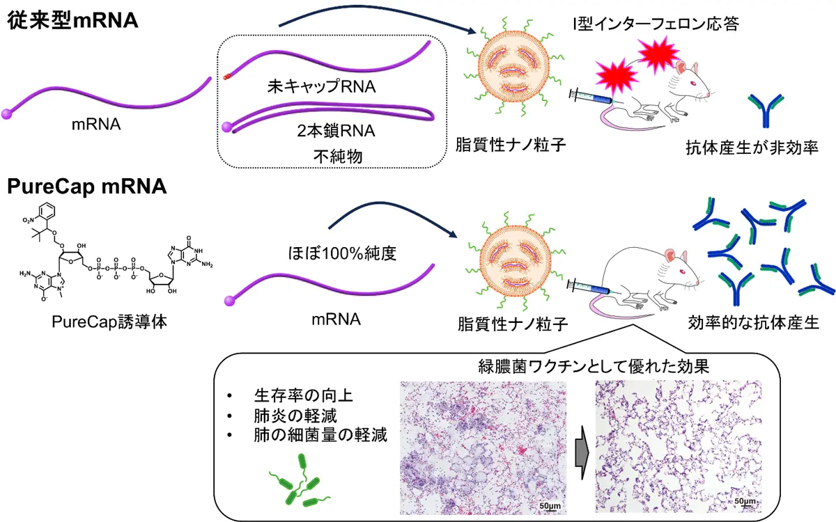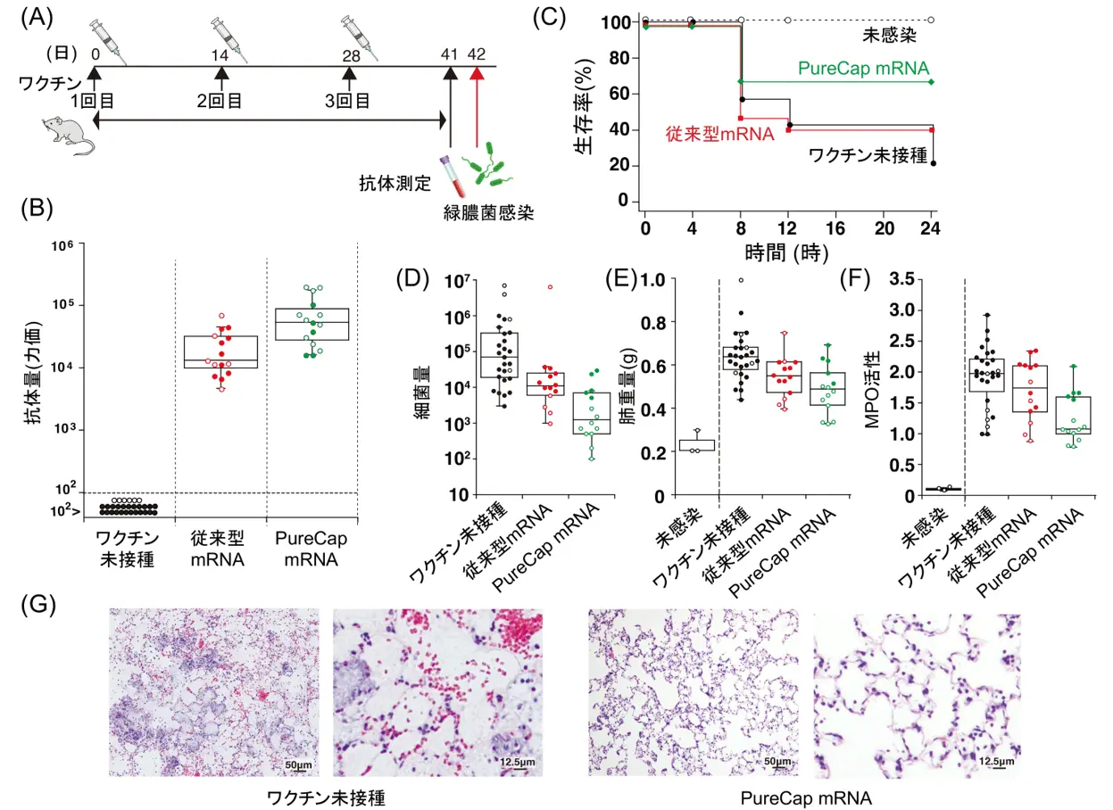 - 本研究では、AMRの主要病原体である緑膿菌を標的としたメッセンジャーRNA(mRNA)ワクチンを、PureCap法と呼ばれる独自のmRNA精製技術を基盤として開発しました。
