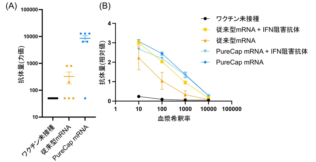 (A)従来型mRNAとPureCap mRNAのワクチン効果を、抗体量(力価)を指標として比較。