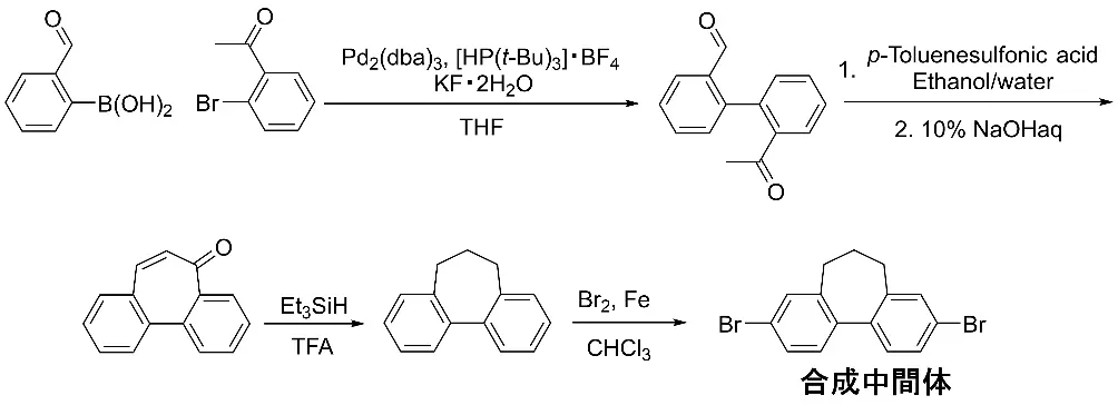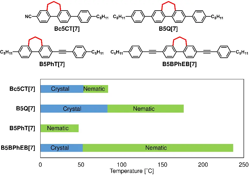 研究チームは以前の研究で、スチルベン骨格に柔軟性のあるn-プロピレン基を導入して7員環構造を形成することで、コンフォメーションの多様性と運動性によるエントロピーの効果により、相転移温度を大きく低下させられることを報告しています。(参考文献)しかし、この研究で用いたのは特殊な液晶分子であり、応用の可能性は限定的でした。今回の研究では、同様のn-プロピレン基からなる環状構造を、汎用液晶材料の基本骨格の一つであるビフェニルに導入した合成中間体を開発しました(図2)。その上で、この合成中間体にフェニル基などの芳香族化合物を導入して共役拡張することで、さまざまな液晶を合成しました。