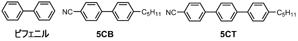 液晶は、固体と液体の中間にある状態です。結晶のような分子の異方性と液体のような流動性を兼ね備えていることから、電場や磁場などの外場応答性を示します。この性質から、外部刺激に応じて光のシャッターとなったり、光の進む方向を変えたりと、光を操ることが可能なため、主にディスプレイや光学フィルムとして幅広く利用されています。最も代表的な液晶分子である棒状のネマチック液晶分子は、末端にシアノ基とペンチル基を有したビフェニル誘導体である5CBです(図1)。5CBは室温でネマチック相を示し、粘度も低く、シンプルな分子構造であることから、市販品として安価で手に入るため、汎用液晶材料として利用されています。しかし、現在の汎用的なネマチック液晶材料は広いπ電子系を持たないため、液晶が一般的に持つ、複屈折性のような光を操る性質を最大限生かすことができません。さらに近年、この光を操る性質と発光やエレクトロニクスなどの機能を組み合わせることを志向して、光・電子機能を持つ長いπ電子系を有するネマチック液晶分子の開発が行われています。しかし、5CBのビフェニルをターフェニル骨格に変えた5CTは、ネマチック相の発現温度が124.2–236.3℃であり、ベンゼン環を一つ増やしただけで5CBよりも発現温度が大幅に高くなってしまいます。このように、π共役長とネマチック相の発現温度にはトレードオフの関係があるため、実装に適した温度で光・電子機能を有するネマチック液晶の実現は困難でした。