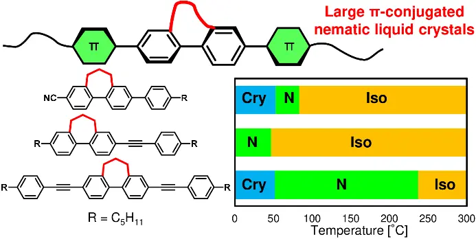 - 有機π電子系液晶:π電子による共役が拡がることにより光・電子機能を示す機能分子を用いた液晶。