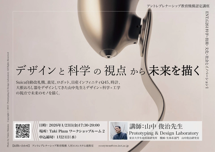 Suica自動改札機、義足、ロボット、日産インフィニティQ45、時計、大根おろし器等をデザインしてきた山中先生を講師にお迎えし、「デザイン×科学×工学」についてお話いただきます。