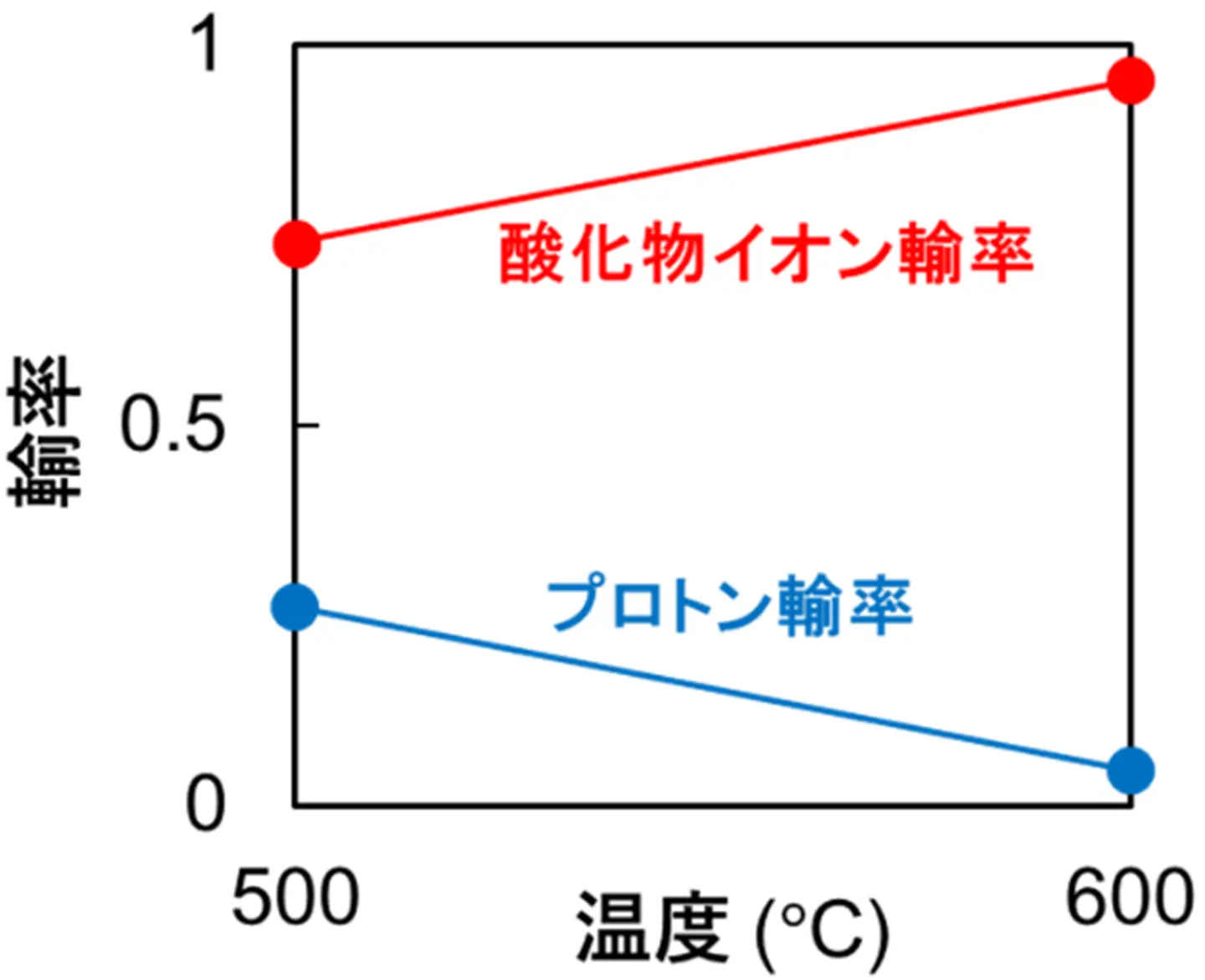 - 酸素濃淡電池、水蒸気濃淡電池、酸化物イオン輸率、プロトン輸率:酸素濃淡電池とは酸素分圧の差(酸素濃淡)によって起電力を生じる電池。また、水蒸気濃淡電池とは水蒸気分圧の差(水蒸気濃淡)によって起電力を生じる電池。これらの起電力を用いて、全電気伝導度 のうち酸化物イオン伝導度 の割合(酸化物イオン輸率) とプロトン伝導度 の割合(プロトン輸率) を見積もることができる。
