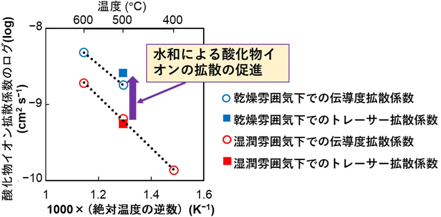また、英国インペリアル・カレッジ・ロンドンのスキナー スティーブン(SKINNER Stephen)教授らと協力して、同位体拡散実験を行いました。その結果、乾燥雰囲気に比べて湿潤雰囲気において酸化物イオンのトレーサー拡散係数(tracer diffusion coefficient)[用語5]が高いことがわかりました(図4の四角)。すなわち、乾燥雰囲気に比べて、湿潤雰囲気において酸化物イオンの拡散係数が高い実験的な直接証拠が得られました。