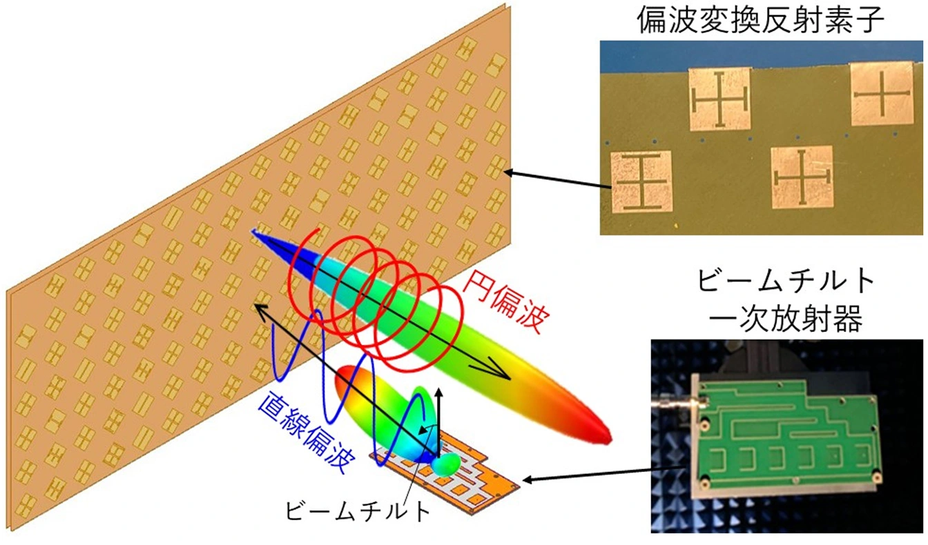 さらに、アンテナを超小型衛星の小さな筐体に搭載するため、展開機構を必要としないビームチルト一次放射器と偏波変換反射素子を採用しました。ビームチルト一次放射器は6素子のアンテナから構成され、各素子を適切な位相で給電することで、リフレクトアレーを効率よく照射します。偏波変換素子は一次放射器から放射される直線偏波を、衛星通信で用いられる円偏波に変換します。これらを組み合わせることで、超小型衛星への搭載と強い電波を同時に満たせることを示しました。すなわち、「小さく収納できるのに遠くまで届く電波」を実現できる可能性を、数値解析と地上試験の両方で明らかにしました。数値解析でビームチルト一次放射器による効率的な照射と直線偏波から円偏波への変換が確認されました。また、高利得なアンテナ特性つまり「強い電波」の放射が地上の電波暗室試験で確認されました。