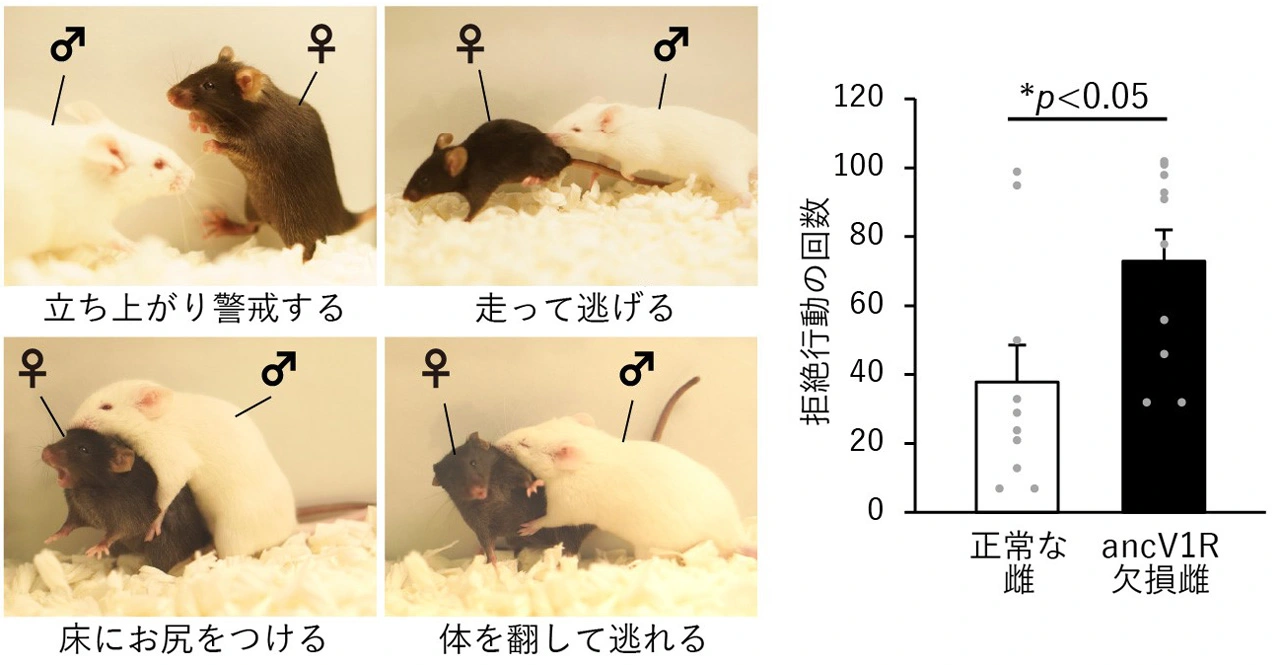 ancV1R欠損雌マウスは、雄の接触や交尾行動の試に対して「立ち上がり警戒する」、「走って逃げる」、「床にお尻をつける」、「体を翻して逃れる」などの拒絶行動を示す。