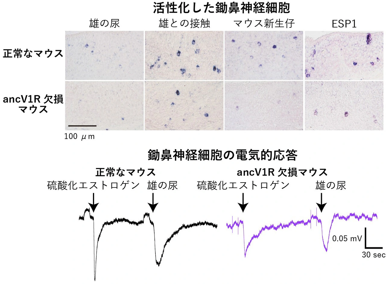 通常、フェロモン受容体は1つの神経細胞で1種類のみが発現しており、特定のフェロモン物質を識別し、神経細胞を活性化させる役割を持ちます。一方、ancV1Rはほぼ全ての鋤鼻神経細胞で発現しており、他のフェロモン受容体と共発現しています。このため、ancV1Rは従来のフェロモン受容体とは異なり、あらゆるフェロモン物質の受容やシグナル伝達に関わる機能を持つと予想されましたが、これまでその機能は明らかになっていませんでした。