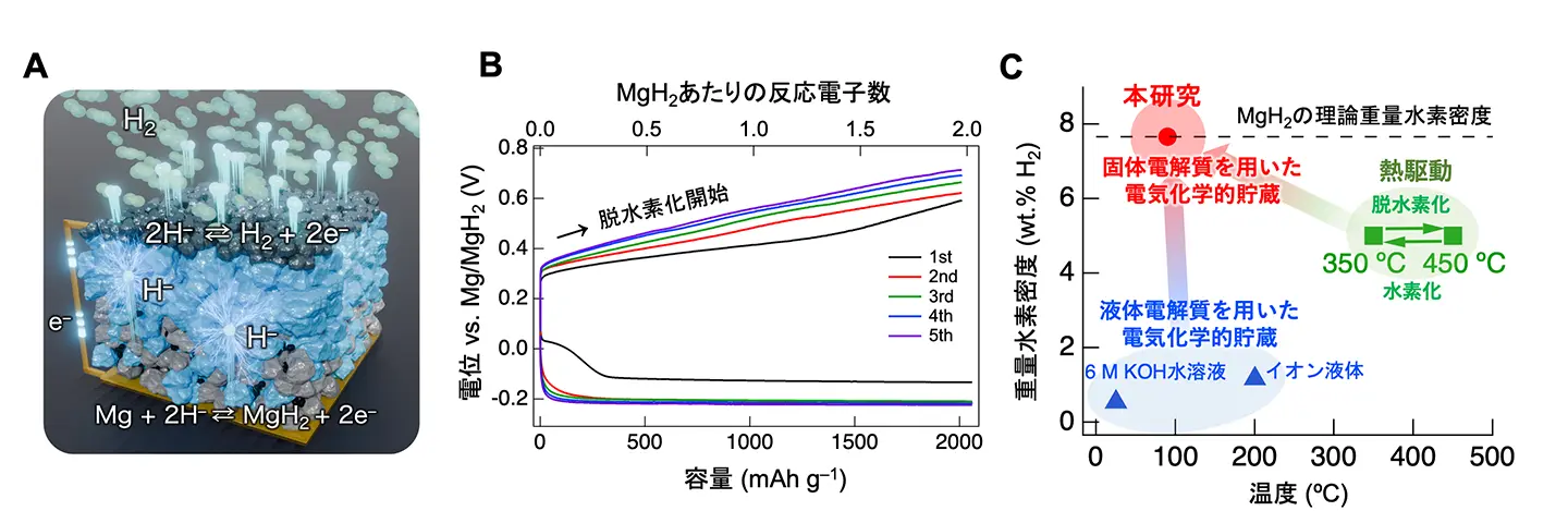 さらに水素貯蔵デバイスとして、作用極の電極活物質[用語12]として水素ガスを用いて、金属Mg電極から固体電解質を通じて水素ガスを吸蔵・放出するMg–H2電池を開発しました(図4A)。このMg–H2電池は、90℃において、Mg/MgH2の理論容量(2,030 mAh g–1)での可逆的な水素吸蔵・放出を実行できました(図4B)。これは、金属Mgの理論的な水素貯蔵量7.6 wt.%に相当します。これにより、これまで300℃以上が必要とされたMgの水素吸蔵・放出反応を大幅に低温化することに成功しました(図4C)。