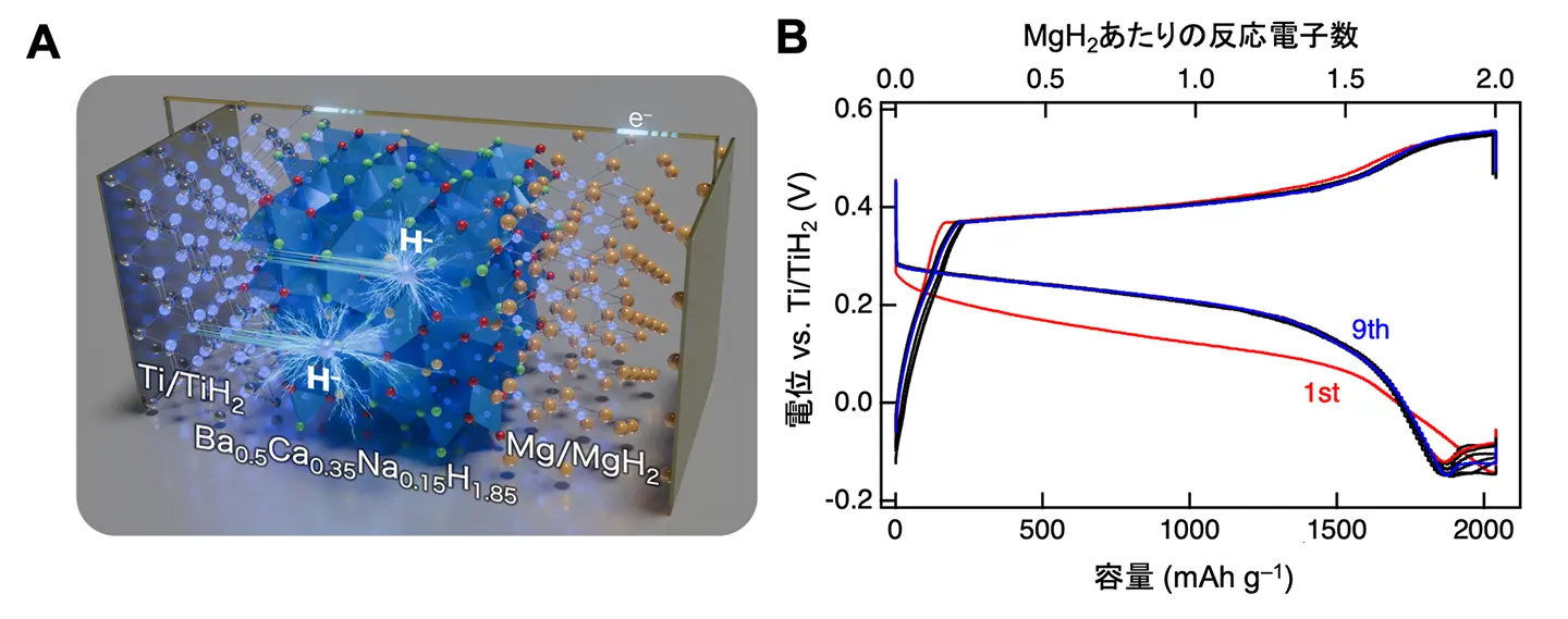 本研究グループは、新規に開発したヒドリドイオン[用語3]伝導体Ba0.5Ca0.35Na0.15H1.85を固体電解質に用いることで、ヒドリドイオン駆動型の水素貯蔵デバイスを新たに開発しました。このヒドリドイオン伝導体は、逆α-AgI型[用語4]の結晶構造を持ち、高いヒドリドイオン伝導性と電気化学安定性を兼ね備えていることが分かりました。この固体電解質を用いた全固体電池は、90℃という低温で、Mg電極の理論水素貯蔵量に相当する高容量の水素を可逆的に吸蔵・放出することを示しました。さらに、水素ガスを吸蔵・放出するMg–H2電池[用語5]を開発し、理論容量の水素ガスの可逆的な吸蔵・放出を実証しました。