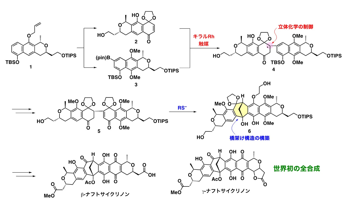 ナフトサイクリノン類は、1974年にドイツの研究者A. Zeeckらによって放線菌から単離された天然物[用語2]で、ピラノナフトキノンが2つの化学結合を介して二量化した特徴的な橋架け構造[用語3]を有しています。しかし、構造決定から半世紀近くが経っても、その構造の複雑さから化学合成は未到のままでした。