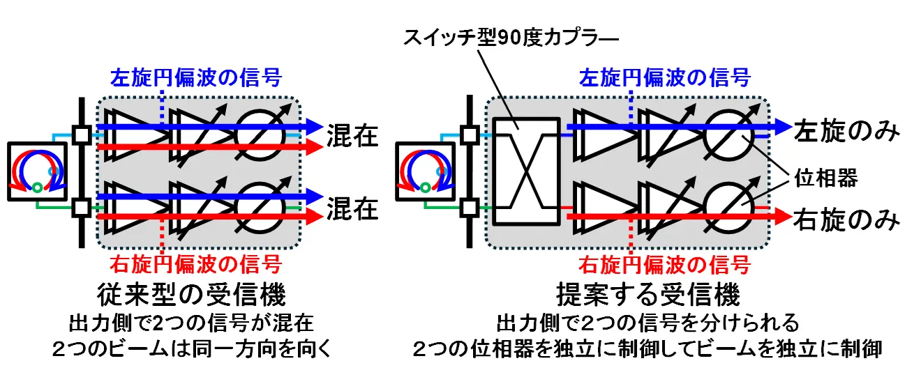- 「スイッチ型90度カプラー回路」を新たに考案し、チップ内部で右旋および左旋円偏波信号を取り出し、独立に位相制御することで従来の2倍のビーム数を実現。