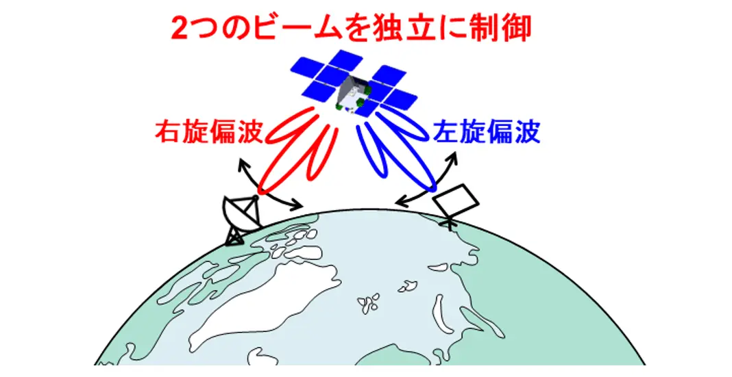 本研究では、「スイッチ型90度カプラーファーストアーキテクチャ」を提案し、右旋・左旋円偏波が重なった二重円偏波を用いた通信において、2つのビームを独立に制御することができるようになりました(図1)。2つのビームを独立に制御することにより、2つの地上局およびユーザー端末との通信が同時に行えるようになります。加えて、設定したビーム角度とは異なる方向から来た信号については利得が大幅に低下するので、同時に受信している2つの偏波の干渉を大幅に低減することができ、通信品質を確保しやすくなります。高い通信品質を確保しやすくなったことにより、より高いデータレート(単位時間に送れるデータ量)で通信を行うことができるようになり、悪天候も通信が行えるようになります。