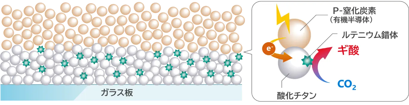本開発では、ガラス平板上に酸化チタン層を堆積させ、その上に有機半導体である窒化炭素を載せて固定化することに成功しました。これによりパネル状にした光触媒にCO2の還元活性点となるルテニウム錯体(以下、RuP)[用語3]を吸着させ、可視光を当てることで、CO2を原料としてギ酸が生成されることを確認しました。