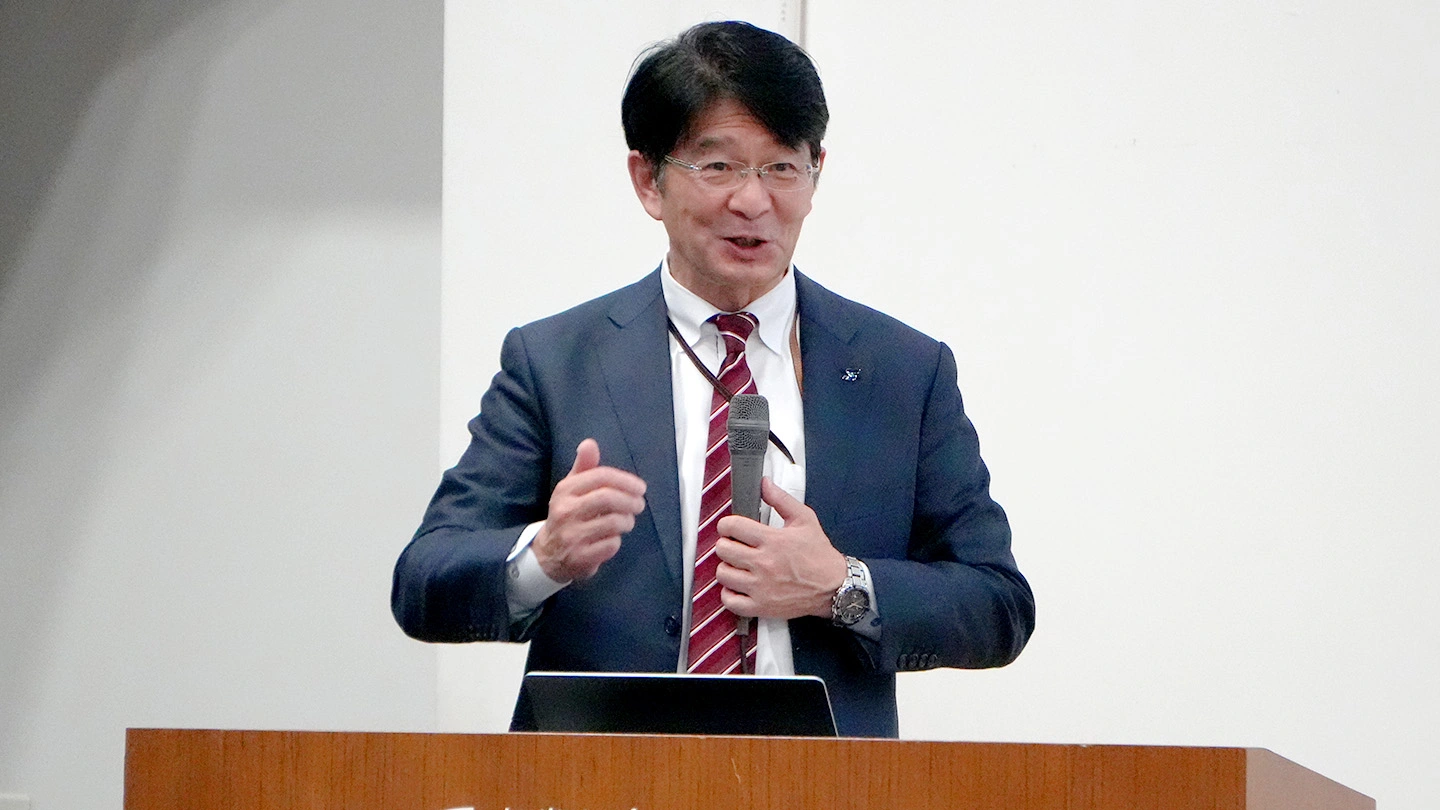 北野政明教授(総合研究院 元素戦略MDX研究センター)は、脱炭素社会におけるグリーンアンモニアの重要性と、その合成を支える革新的触媒研究について講演を行いました。従来のハーバー・ボッシュ法は高温・高圧を要し世界的なエネルギー消費負荷が大きいこと、新規エレクトライド触媒やハイドライド触媒、遷移金属を用いない新材料触媒など、基礎科学の進展が低温・低圧プロセスの実現を後押ししていることを紹介しました。加えて、スタートアップとの連携による実証プラント稼働など、産業化への動きも加速していることについて、実例を交えて説明しました。