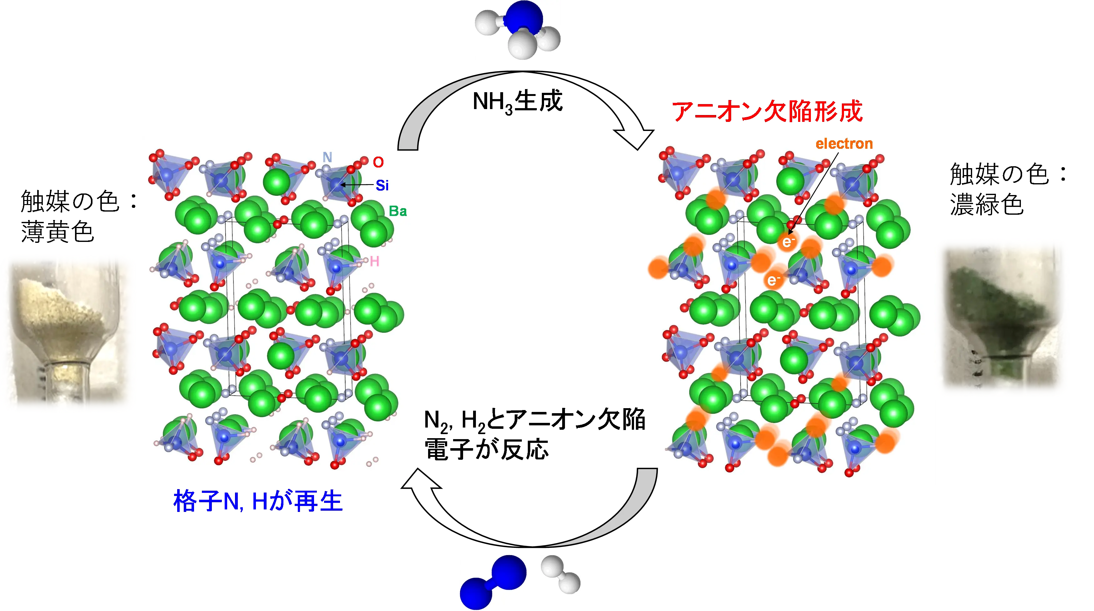 Ba3SiO5-xNyHzは、アンモニア合成反応温度で容易にH−およびN3−が結晶の表面から脱離し、アニオン欠陥を形成し、そのアニオン欠陥に電子が捕捉されます。それに伴い材料の色も薄黄色から濃緑色へと変化します。アニオン欠陥を有するBa3SiO5-xNyHzをアンモニア合成反応雰囲気(合成に適切な環境となるよう、窒素および水素で満たした状態)で加熱すると、アニオン欠陥電子と窒素および水素ガスが反応し、格子H−およびN3−が再生され、触媒の色も薄黄色へと戻ります。X線回折パターンからも、欠陥形成後はピークが高角度側にシフトし格子体積が縮んでいることが確認されましたが、窒素および水素ガスとの反応後は、X線回折ピークも元の位置に戻り、結晶構造も完全に元の状態に戻ることが確認されました。一方、Ba3SiO5や既存のケイ酸塩系酸窒化物では、800℃以上に加熱してもアニオン欠陥が形成されません。Ba3SiO5-xNyHzに窒素ガスを反応させると、窒素分子が欠陥サイトに捕捉され、窒素分子に電子が供与されN≡N結合が弱められる現象が起きることが、赤外線吸収分光測定により確認されました。反応条件下では、最終的に窒素分子も水素分子も結合が切断され、アニオン欠陥の電子と反応し、H−およびN3−として欠陥サイトに捕捉されます。これらの結果から、Ba3SiO5-xNyHzは、アニオン欠陥サイトの形成および格子H−およびN3−の再生を繰り返しながらアンモニアを合成していることが示唆されました(図3)。