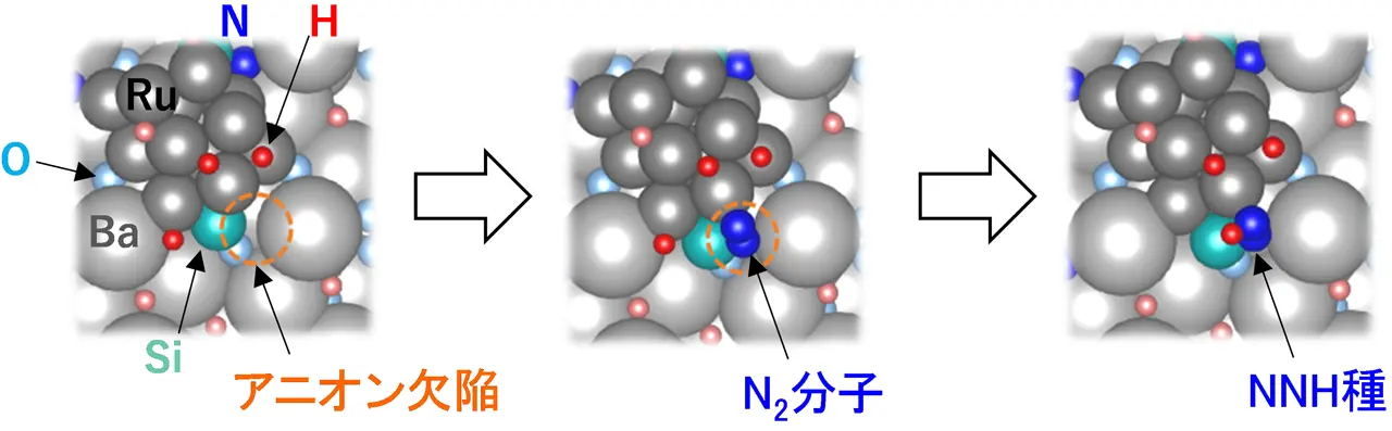 アニオン欠陥に捕捉された窒素(N2)分子は、二つの窒素原子に分かれてから水素原子と結合するのではなく、水素化されて一旦NNHx(x=1-3)の状態となったのちにアンモニアとなる。