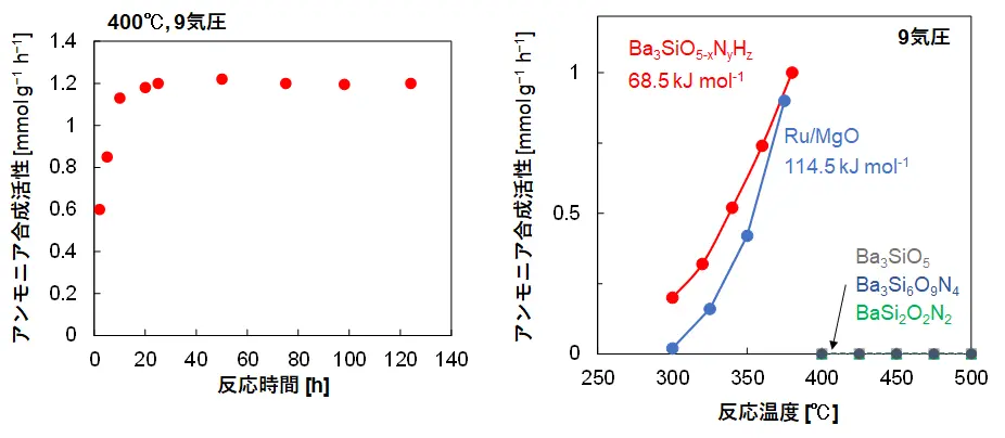 Ba3SiO5-xNyHzを触媒として用い、アンモニア合成を行ったところ、100時間以上安定してアンモニアを生成できることが分かりました(図2左)。生成したアンモニアは、Ba3SiO5-xNyHzが有している格子中のH−およびN3−の数よりもはるかに多いため、Ba3SiO5-xNyHz中の窒素や水素が消費されたわけではなく、触媒的に反応が進行していることが確認されました。また、図2右に示すように、Ba3SiO5-xNyHzはルテニウム(Ru)を酸化マグネシウム(MgO)に固定した触媒(Ru/MgO)よりも特に低温域で高いアンモニア合成活性を示しました。例えば、反応温度300℃ではRu/MgO触媒の10倍の反応速度を示し、46 kJ mol-1低い活性化エネルギー[用語7]