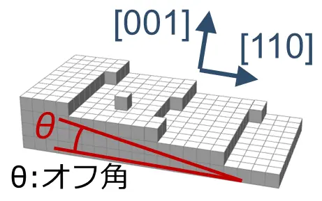 このようなステップフロー成長を実現するために、微小な傾斜を持たせたオフ基板を用いました。オフ基板はベースとなる基板を数度から十数度の角度でカットしたものです。図2に示すように、オフ基板には「ステップ」と呼ばれる階段状の構造があり、その高さは理想的には1原子層とされています。微小な傾斜の角度はオフ角と呼ばれ、これによってステップ間隔(テラス幅)が決定します。しかし、低温成長(~280℃)では原子表面拡散長が短いため、ステップフロー成長法が十分に機能しない可能性があります。そこで、研究チームはテラス幅が短い10°オフGaAs (001) 基板上に (Ga,Fe) Sb (Fe濃度24%) の成膜を試みました。