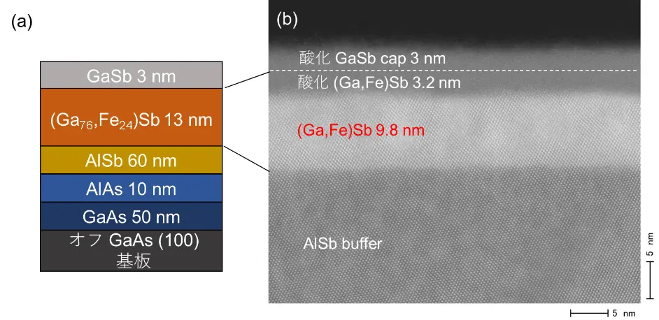 図3(a)に作製したサンプルの断面構造を示します。GaAsと (Ga,Fe) Sbの格子定数が異なるため、AlSbバッファー層を挿入しました。RHEED法[用語5]による表面観察で、今回の成膜温度280℃でも、ステップフロー成長法が十分に機能したことを確認しました。図3(b)に作製したサンプルの電子顕微鏡像を示します。