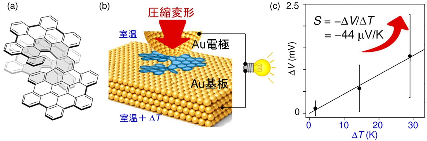 研究チームは、π共役系[用語4]を拡張した炭素骨格ヘリセン分子を設計・合成し、金電極との多点π相互作用を利用した安定な単一分子接合を形成しました。さらに、電極を押し込んで分子構造を圧縮した際の分子接合の性質を、ブレークジャンクション法[用語5]を用いて測定しました。その結果、電気伝導性および熱電能が大きく変化することを確認しました。特に、熱電能は最大−44 μV/Kに達し、π共役分子の単一分子接合としては大きな値を示しました(図1)。本研究は、分子構造に対して圧縮や伸張といった機械的変形を加えることによって電子輸送特性を制御できることを示したものであり、将来的には分子スケールの熱電デバイスやエネルギー変換材料の設計指針につながることが期待されます。