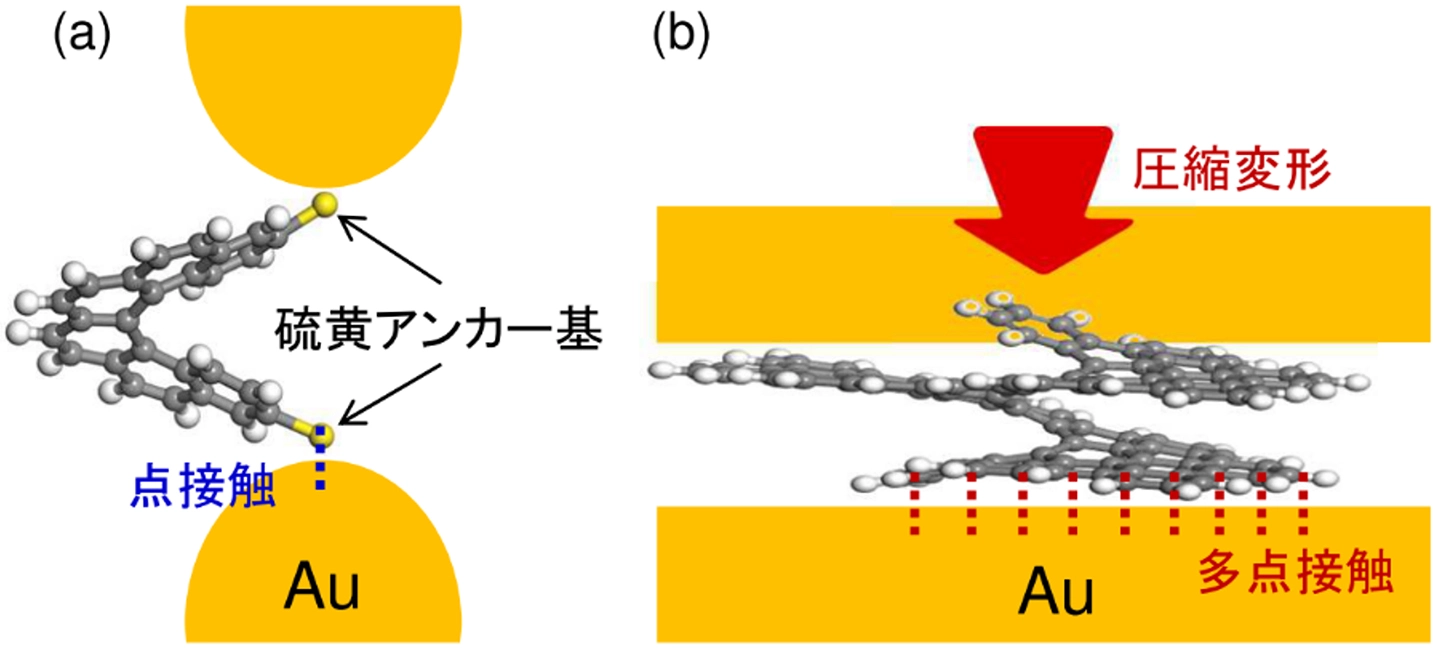 - 単一分子接合に適したπ拡張ヘリセン分子を新たに設計し、金電極とπ電子の多点相互作用による安定な分子接合の形成に成功。